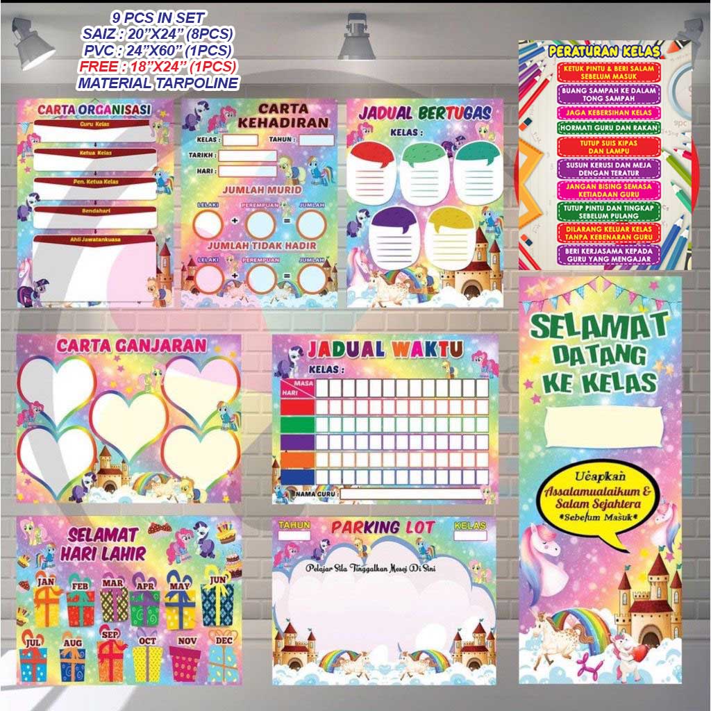 Set hiasan kelas, set pak 21, 8 item dalam 1 set* woww semangat pelajar nak masuk kelas macam ni.